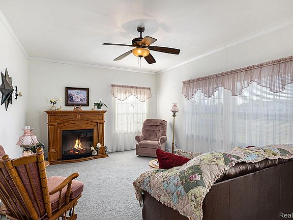 The second living room features a cozy electric fireplace that stays with the home, adjacent to the first full bathroom and two generously sized bedrooms. On the other side of the home, the primary bedroom offers a large walk-in closet and a spacious bathroom complete with a jetted tub and separate shower.