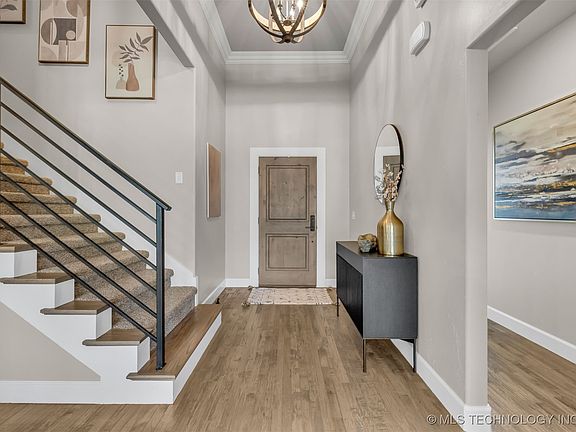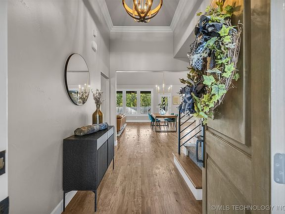 Beautiful Home Backing to a Wooded Greenbelt in Dutchers Crossing II, Bixby West! Thoughtfully updated and filled with natural light, this home features vaulted ceilings, new carpet, newer paint, updated fixtures, and elegant marble countertops throughout. Designer lighting, warm hardwood floors, and quality finishes create a timeless and move-in ready space. Step through the Foyer into an expansive Great Room with a beamed ceiling, marble-accented fireplace, and large windows framing the wooded view. The open layout connects the Dining Area and Kitchen, featuring marble countertops, stainless appliances, custom cabinetry, stylish backsplash, and a walk-in Pantry. The main level includes a private Study or optional fourth Bedroom with vaulted ceilings and an en suite Bath—ideal for guests or a Home Office. The Primary Suite offers a relaxing retreat with dual marble vanities, a soaking tub, and a walk-in shower. Upstairs, a spacious Game Room joins two comfortable Bedrooms and a Full Bathroom. The Utility Room includes a sink, window, and generous storage. Outside, the covered Patio with outdoor fireplace overlooks the wooded greenbelt, offering a peaceful setting for everyday living and weekend gatherings. A three-car Garage provides ample space for vehicles and storage. Dutchers Crossing II offers community amenities including a pool, park, and scenic pond views.