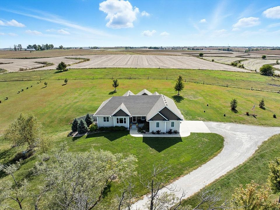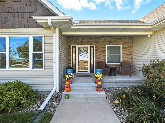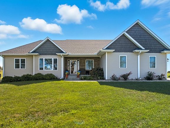 Situated on 8.87 acres just minutes from town! Seamless open layout with vaulted ceilings connects the living, dining, and kitchen areas. The kitchen shines with hickory cabinets, quartz countertops, and a double oven, perfect for entertaining. Rich wood flooring and a stone-accented fireplace add warmth. Main level offers 2 bedroom which each include an ensuite with private baths, walk-in closets, plus laundry and drop zone. Enjoy the 4-season room with vaulted ceiling and walk-out to a covered deck. Finished walk-out basement with family room, wet bar, 2 bedrooms, and full bath. 24x32 shop with water, electric, and concrete floor, great for a mancave, shop or horses! Call today!