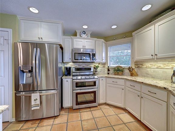 Impeccably maintained waterfront home at an incredible price! Shows better than new with an abundance of upgrades! With it's open floor plan and Saltillo tile throughout, this home flows beautifully for entertaining & relaxing. The cook's dream kitchen which overlooks the pool, has upgraded stainless steel appliances, a brand new (one week!) refrigerator, 5-burner gas stove with dual fuel, granite countertops, tumbled marble backsplash, built-in spice rack, custom cabinetry all with pull outs, under cabinet lighting and a breakfast bar! Large primary bedroom has double door entry, water views & private access to the pool. The newly renovated primary bath is a spa retreat with it's dual sinks, freestanding tub, tile shower and dual closets. Step outside to experience your outdoor oasis complete with heated sports pool with hot tub on a quiet canal. Lots of decking & covered boat lift. New 30-year roof in 2017. Corner fireplace & push button, electric hurricane shutters.