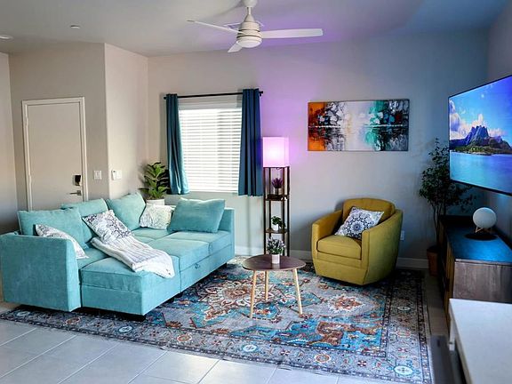 Explore this exquisite, newer built home with deluxe comforts and designed for the ultimate desert retreat in style. Just 15 min from Palm Springs and close to acclaimed spas and hot springs, it's also within 30-45 min to Coachella and 35 min to the wonders of Joshua Tree. A modern design and an open floorplan, the kitchen features stainless steel appliances, quartz countertops and bar seating. Enjoy the convenience of an In-home, side by side washer and dryer, along with a spacious 2-care garage, complete with Electric Vehicle charging station. The gorgeous backyard is perfect for relaxing and entertainment. Enjoy sitting around the cozy firepit, relaxing in the hammock, dining al fresco, a putting green and marveling at the gorgeous city/mountain views in the hot tub.