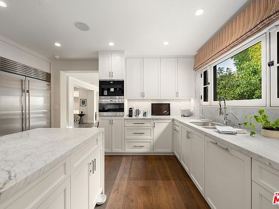 Perched in the Hollywood Hills, this stunning Spanish Revival estate seamlessly blends classic architecture with modern luxury. Tucked away in a private setting yet moments from the heart of West Hollywood, the home offers breathtaking panoramic views stretching from the city skyline to the Pacific Ocean. Step through the gated entry into a world of elegance, where exposed wood beams, arched doorways, and custom millwork evoke Old Hollywood charm. The spacious living areas are bathed in natural light, with French doors opening to serene outdoor spaces. The gourmet kitchen is a chef's dream, featuring marble countertops, top-of-the-line appliances, and a seamless flow into the dining room, perfect for entertaining. The primary suite is a tranquil retreat, boasting a fireplace, wraparound windows, and a spa-like bathroom with a soaking tub positioned to take in the spectacular views. Additional bedrooms are thoughtfully designed, including a guest suite with its own private entrance. A library wall with a rolling ladder, cozy sitting areas, and an artistically curated interior complete the home's sophisticated ambiance. Outside, the lushly landscaped grounds feature a resort-style infinity pool, a sun-drenched terrace, and multiple lounging areas ideal for relaxation or hosting under the stars. The detached guest house provides flexible space for visitors or a private studio. With its unparalleled views, timeless architecture, and prime location, this exceptional residence captures the essence of Hollywood Hills living at its finest.