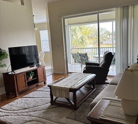 Fully furnished Off Season rental from April 1 2025 to Dec 15, 2025. The price quoted is for 7 or 8 months, but you may be able to rent it for as little as 2 months with a 11.5% tourist tax at a higher monthly rate. This spacious 2 bedroom 2 bath with extra room that is furnished as an extra sitting area, but can double as an office if needed, gives you so much space. You will be delighted by this home from the wood flooring to the fantastic water view complete with lighted water feature that can be seen from the kitchen, living room and master bedroom and lanai. The large lanai gives you the perfect spot to enjoy the beautiful Florida weather. The home is in beautiful condition. The attached two car garage makes this the perfect home for you. The community is gated and is conveniently located off of Daniels between 41 and the Interstate. There is a lovely clubhouse with two pools, fitness center and dock. There are also tennis courts and basketball. Call to make an appointment to see this lovely home. Any stay of 6 months or less will require a payment by tenant of the 11.5% State and County Tourist Tax.