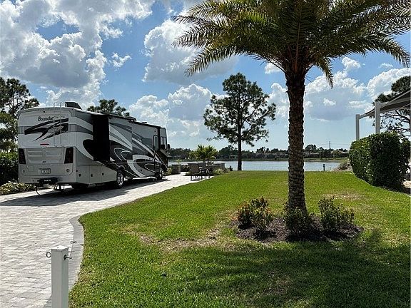 Woah! Huge Price Improvement!! If you are looking for a Fabulous property in the Sunshine State for your Class A or Super C Motorcoach, you have found it here!! This lakefront location with a million-dollar view can be your very own piece of paradise. The lush tropical landscaping provides beauty and privacy. The lot is 55' X 110' so just over 6,000 sq ft with a beautiful, spacious paver pad, and all the hookups to make Motorcoach living a breeze. Being located within Golden Palms Luxury Motorcoach Resort will give you access to activities and amenities for everyone including a heated pool, spa, sauna, exercise room, pickleball courts, a 1-acre dog park for your furry friends, & a 22-acre lake for catch and release fishing. You will be surrounded by nature but only a short drive to restaurants, shopping, golf courses, airports, & all the Gulf beaches. Let's take a tour today.