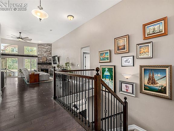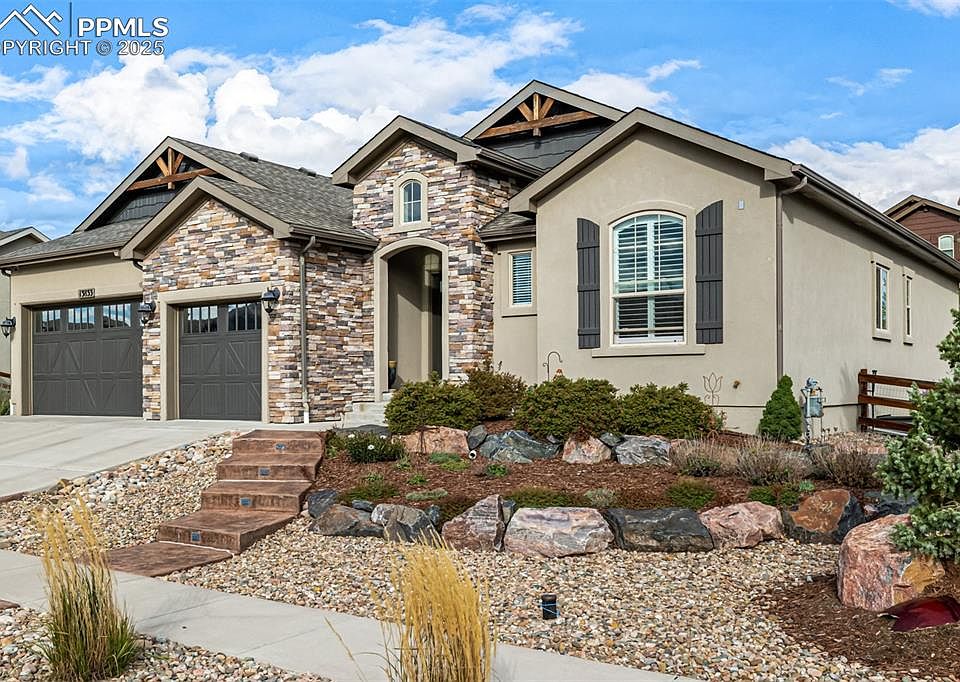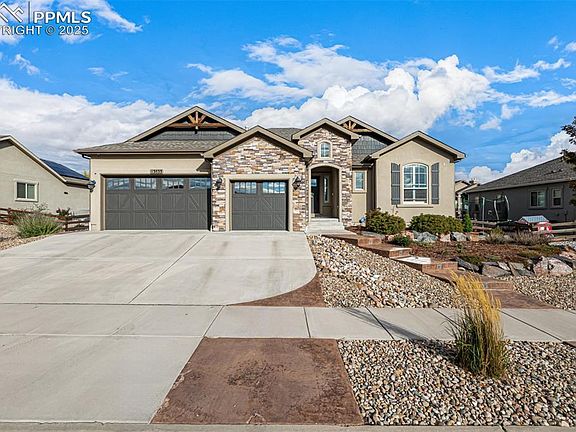 Welcome to this beautifully crafted ranch-style home in the highly sought-after Morningview at Gleneagle community. Offering partial mountain views and elegant design throughout, this home blends luxury, comfort, and functionality. Step inside to soaring 12-foot ceilings and an open-concept layout filled with natural light. The main level includes three bedrooms, a dedicated home office, and a formal dining room with barn doors that open to the backyard—ideal for indoor-outdoor entertaining. The gourmet kitchen features a large leathered granite island, soft-close cabinets, walk-in pantry, and premium stainless steel appliances, including double ovens, a gas range, and a French door refrigerator. The spacious living room centers around a gas fireplace with stone surround and wood mantel, creating a warm, inviting atmosphere. The primary suite is a true retreat, featuring a spa-inspired en-suite with dual vanities, a walk-in shower with dual heads, and a large walk-in closet. The finished basement offers 9-foot ceilings, a large rec room, wet bar, and two additional bedrooms with walk-in closets. One is a junior suite with a private full bath and double sinks—perfect for guests or multigenerational living. Additional highlights include a 3-car garage, laundry/mudroom with built-in cabinetry and utility sink, plantation shutters, an On-Q home audio system, whole-house humidifier, radon mitigation system, and a spacious storage room. Enjoy Colorado’s beautiful weather in the professionally landscaped, low-maintenance backyard featuring a stamped concrete patio, walled seating area, built-in gas BBQ, and custom gas fire pit. Located just minutes from I-25, shopping, dining, and top-rated District 20 schools, this home offers the ideal blend of luxury, convenience, and lifestyle.
