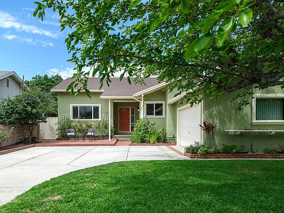 Nestled in the foothills of Sylmar, along a tree-lined street, this updated ranch home is a true gem. The grassy front yard & roses lining the driveway create a welcoming approach to the front door. Upon entering, original hardwood floors greet you, leading to a charming living room with crown molding & solar tube lighting. The living room opens into a step-down family room featuring tile flooring, a vaulted ceiling, dual-paned windows & a sliding glass door that leads to the backyard & patio space. To the right of the entry is the first of 3 bedrooms, boasting parquet hardwood flooring, dual-paned windows & an ensuite bathroom with a glass & custom-tiled shower enclosure, a custom-made single sink vanity & an additional door to the laundry room. The galley-style kitchen features granite countertops, cabinets with soft-close drawers, a new 5-burner GE gas range, refrigerator & dishwasher. The kitchen opens to the dining/breakfast nook area by a window with custom-made storage bench seating. The adjacent laundry room includes a utility sink, storage cabinets & a door to the side patio & garage. On the opposite side of the home, to the left of the entry, are two additional bedrooms & a bathroom. The second bedroom at the front of the home offers dual-paned windows, hardwood flooring & new LED lighting. The full bathroom features a single sink vanity with stone countertops, a tub & shower combination with a glass enclosure & tile up to the ceiling. The third bedroom at the back of the home is spacious with a ceiling fan, ample closet space, dual-paned windows & hardwood floors. The detached two-car garage & sizable driveway provide plenty of parking. The backyard is perfect for entertaining or relaxing, with a brick patio space, a gravel seating area with a fire pit & a grassy area with a playset. On the side of the home is a pergola-covered patio area ideal for dining al fresco. Additional features include solar panels & central air & heating, making this home both comfortable & energy-efficient. Don't miss this opportunity to own a beautifully updated home in a prime Sylmar location!