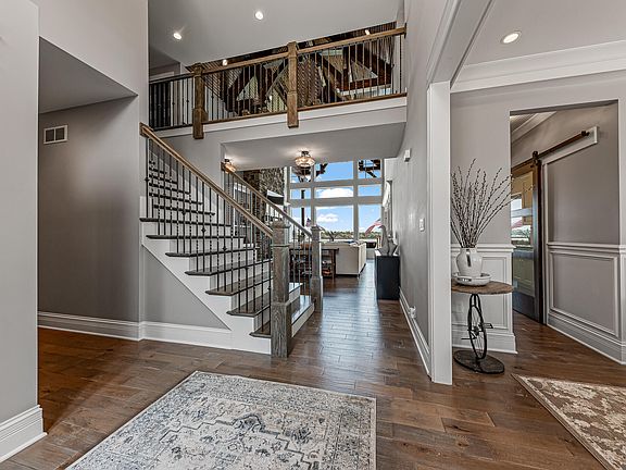 Discover the epitome of lakefront living in this stunning custom-built home on Cedar Lake. Combining modern luxury with unique architectural features, warmth, and rustic charm, this home is the perfect retreat. Enjoy breathtaking lake views through the expansive, oversized windows that fill the interior with natural light. The exquisite hardwood flooring, upgraded white trim, 3-panel doors, & hand-selected light fixtures enhance the home's luxurious ambiance. Highlighting the main floor is the great room, which features a soaring beamed ceiling with a plank finish, a magnificent floor-to-ceiling stone fireplace, & built-in cabinetry. This room offers the perfect space to relax & enjoy the stunning lake views. The beautifully designed custom kitchen is a chef's dream, equipped with elegant white cabinets, quartz countertops, upgraded stainless appliances, & a spacious dinette area. Also included in the kitchen are a walk-in pantry & a Butler's pantry/Beverage Bar. Adorned with a coffered ceiling, the formal dining room is ideal for hosting dinner parties. Offering a tranquil retreat, the main floor primary suite is a sanctuary, featuring a beamed ceiling, a large walk-in closet, & a spa-like bathroom. On the 2nd floor, you'll find 3 bedrooms, 2 full bathrooms, and a versatile bonus room. The finished walkout basement is an entertainer's paradise, complete with a family room, custom bar, a full bathroom, & an exercise room/potential 5th bedroom. This level also provides access to a covered patio, perfect for outdoor gatherings. The exterior of the home is equally impressive, featuring a dock/pier, a Trex deck, beautiful walking paths, professional landscaping, and a custom firepit. Located near the beach, restaurants, parks, and excellent Hanover Schools, this home offers the best of both worlds - a peaceful retreat with convenient access to all the necessities. Live the lake life you've always dreamed of in this custom-built home!