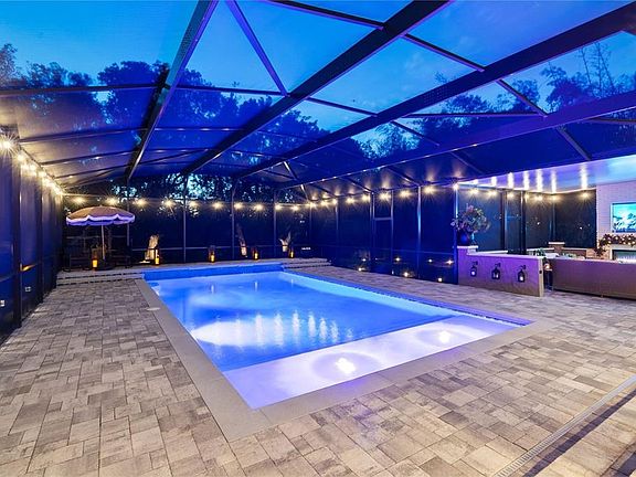 Stone-accented water-vapor fireplaceWaterfall-edged quartz countertopsScreened heated saltwater poolHigh-end finishesSpa-like bathCustom wrought iron doorsStylish playroom