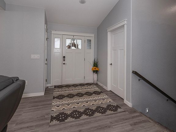 The majority of the flooring on the main floor is premium vinyl plank. The living room has vaulted ceilings and a gas line behind the angled wall where the television is currently located. The homeowners planned for a future fireplace to be installed. The kitchen has beautiful granite countertops and a spacious walk-in pantry. The primary suite also has vaulted ceilings. The primary bathroom has lavish upgrades to include a 2-person jetted tub and a custom tile shower. A large custom walk-in closet has tons of storage space and a make-up vanity with a light mirror. The mud room is where you will find the washer and dryer along with granite countertops and a utility sink. The second full bathroom can be found on the main floor, too.