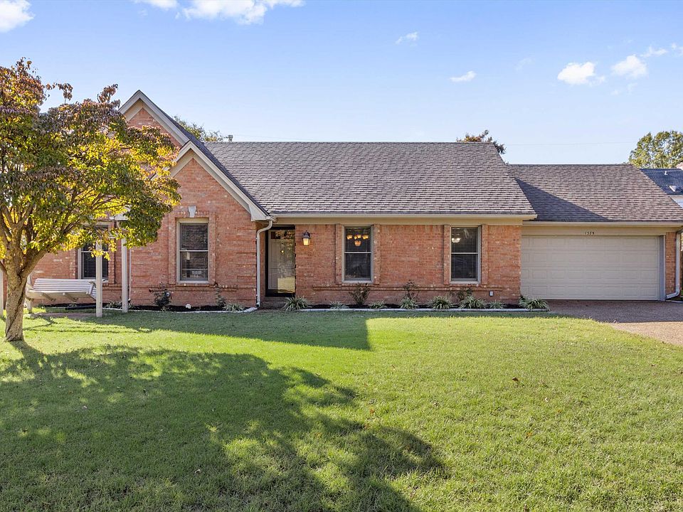 Perfect 1 story home in great Cordova location! Close to everything but tucked away on a quite cove. Spacious great room with vaulted ceilings, gas fireplace and French doors that open to HUGE covered patio. Updated kitchen and breakfast room with granite countertops and new tile floors. Dining room opens to Great room. Pantry and good size laundry room. 3 bedrooms all on one level, 2 full bathrooms. Updated flooring throughout. Hall bath with updated vanity. Primary bathroom with XL soaking tub. Enjoy the private backyard on the 47x11 covered patio plus great storage building out back. Seller is offering a Choice Home Warranty for buyers! This property qualifies for Cadence's 100% Right at Home Loan. Zero Down Payment!