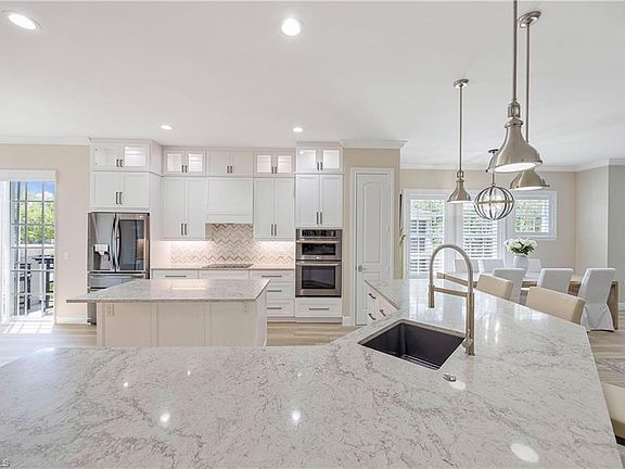 Brand New Elevator Being Installed! Step into this beautifully remodeled 3-bedroom, 2-bath coach home with a 2-car attached garage, where modern craftsmanship meets comfortable luxury. Every detail has been thoughtfully designed for style, function, and ease of living. At the heart of the home is the gourmet kitchen with a brand-new island, quartzite countertops, a 3” island extension, solid wood cabinetry with glass-front uppers, a chevron-patterned backsplash, new stainless steel appliances, and a built-in bar with wine cooler and glass display cabinets—perfect for entertaining. Just off the kitchen is a built-in desk, ideal for organizing daily life. Sliding glass doors open to a private balcony, perfect for morning coffee or quiet evenings. The expansive primary suite includes a cozy sitting area, two custom walk-in closets, and sliding doors that lead directly to the patio, where you can relax and enjoy the thoughtfully maintained landscaping. The spa-like bath features a Jacuzzi tub, a frameless shower, dual vanities with quartzite counters, and upgraded fixtures. Additional bedrooms offer flexibility for guests or the perfect space for a home office or hobby room. The laundry room is equipped with custom cabinetry, a deep utility sink, and ample storage. Throughout the home, you’ll find solid wood stairs, Italian porcelain tile, crown molding, 6" baseboards, LED lighting, plantation shutters, a powder-coated railing, and fresh interior paint that enhances the home's crisp, modern feel. A dedicated elevator shaft is already in place, offering future flexibility without major construction. Major upgrades include new appliances, a new A/C, tankless water heater, sinks, high-end lighting and fixtures, custom closets, an epoxy-coated garage floor, a beautifully redone patio enclosure with new screens and metal, and a security system. The home is equipped with impact-resistant windows and doors, offering peace of mind and storm protection. The roof was replaced in 2020. There are far too many thoughtful enhancements to list—this home is truly turnkey and meticulously finished. Resort-style amenities include a clubhouse with a catering kitchen, fitness center, heated pool and spa, grilling area, and walking paths. The community is gated, and ideally located close to a hospital, golf, shopping, and dining. Nestled in a quiet cul-de-sac just minutes from Wiggins Pass State Park and Naples' stunning Gulf beaches, this move-in-ready home is perfect for downsizers, retirees, and seasonal residents seeking a refined, maintenance-free lifestyle. Don’t miss the opportunity to experience the luxury, comfort, and convenience this exceptional home offers.