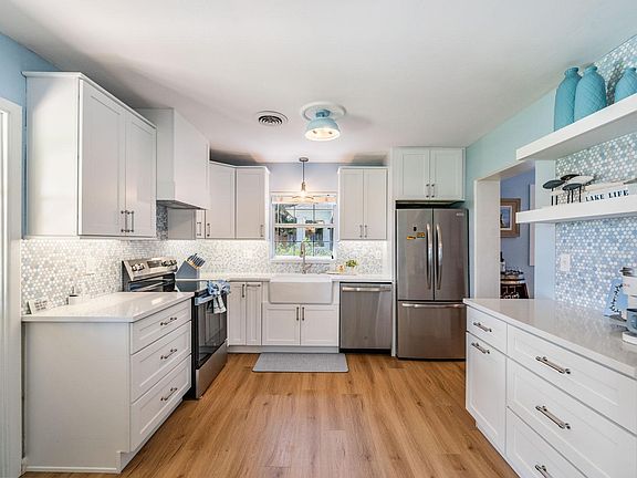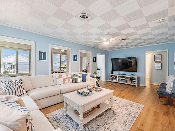 The "Blue Canoe Lakehouse" has been freshly remodeled with the most thoughtful and tasteful touches. After enjoying the beach, covered dock, restaurants accessible by water, boat rentals and Lake Weir, enjoy the comforts of this beautiful home. With room to sleep 8, this home offers luxurious comforts to rest and recharge from a long day on the water. As you enter the home you find the kitchen, breakfast nook, and sitting area with a comfortable couch, that sleeps 2 as a trundle bed. Moving into the dining room, you see the living room and separate sitting room with lake views. The sitting area provided a sleeper sofa that sleeps 2. Down the hall you find 2 bedrooms and 2 bathrooms. The laundry room is in the separate building by the commercial ice maker, attached via a covered porch. Lakeside, enjoy a large deck off the house with ample sitting room accompanied by 2 covered lounging areas on the dock. Bring your boat! There are 2 boat ramps on Lake Weir and 2 restaurants both navigable by boat and anchor out right front by the beach. Want to stay in? Publix is 15 minutes away or order Kroger delivery is available as well. There are boat and jet ski rentals available through Eaton's Beach.
