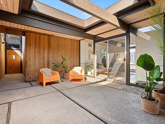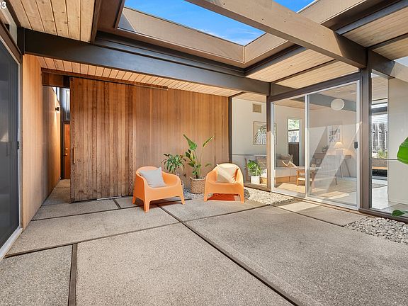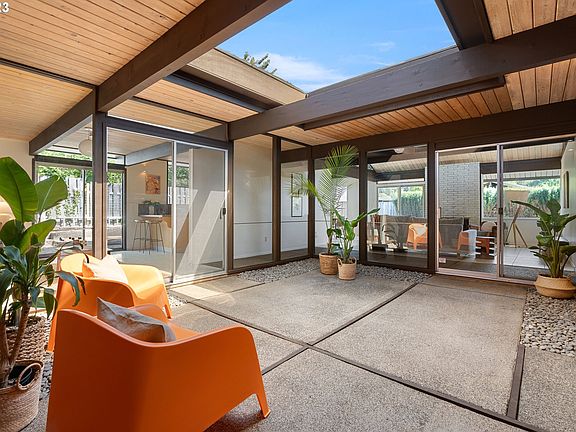 Rummer Alert! This rare K-4 Model is a bright and airy space with a large skylight in the central atrium, soaring vaulted tongue and groove wood ceiling in the living room, floor to ceiling windows and sliding glass doors throughout bringing so much natural light in. The slab on grade construction provides a concrete floor base throughout (currently under other types of flooring), with a radiant heating system within the floor. The connection between indoor and outdoor living is seamless in the living room with a wall of windows that overlooks the patio and backyard space. This Rummer floor plan offers an ideal layout with the living room open to the dining space, kitchen and flex space all wrapping around the central atrium with a wing of four bedrooms and two full bathrooms The primary suite features the trademark Rummer sunken Roman bath-shower and the bedroom has sliding glass doors to the private yard. New roof and paint, this special home is just waiting for your personal design touches! Located in the desirable Menlo West neighborhood with close proximity to Nike, Intel, downtown Beaverton features an incredible farmers market, parks,library and popular local restaurants.