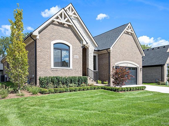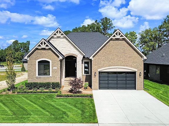 Refined elegance meets considered craftsmanship in this custom 2,374 sq ft ranch, ideally positioned on a premium lot in Washington Twp’s Villas of Veridian. A full brick and stone elevation with decorative gable trusses, exposed aggregate steps, and a 31-ft covered loggia with wood-plank ceiling and recessed lighting set the tone for timeless curb appeal and outdoor living.Inside, 12-ft ceilings, 8-ft solid-core shaker doors, and wide-plank white oak floors define a light-filled open layout. The family room centers on a floor-to-ceiling porcelain fireplace with white oak mantel and floating shelves, framed by Andersen windows with black exterior trim, vertical panes, and transoms. A box beam ceiling with tray detail adds volume and architectural character.The kitchen is anchored by Lafata soft-close cabinetry with espresso island, 42” uppers with crown, quartz slab backsplash, under-cabinet lighting, vented hood, and a centered stainless sink beneath a panoramic window wall.The primary suite includes a freestanding Mansfield AVA tub, frameless Euro shower with Mosetic™ ribbed tile and quartz bench, dual quartz vanities, matte black Kohler fixtures, and private water closet. All baths feature quartz counters, 42” mirrors, and curated tilework; the powder room adds basketweave mosaic flooring and gold-tone accents. The laundry offers Lafata cabinets, quartz counters, deep stainless sink, gooseneck faucet, and large-format tile.Additional features: custom mudroom bench with shiplap backing, oversized 2-car garage, Bryant high-efficiency furnace, LED ceiling fans, and full daylight basement with bath rough-in. Immediate occupancy. Builder to include garage door opener. Buyer may select foyer + kitchen chandeliers (installed prior to close). Preferred Lender offers 1% interest rate buy-down (Year 1) + free appraisal.