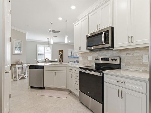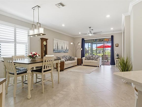 Experience the best of IslandWalk living, where an active lifestyle meets Royal-class amenities in this exceptional, one-of-a-kind, TURNKEY Villa. From the moment you arrive, the meticulous care and thoughtful upgrades throughout the home speak to a level of quality rarely found. Step inside to a bright, open Great Room finished with CROWN MOLDING, PORCELAIN TILE laid on a diagonal throughout, and PLANTATION SHUTTERS carrying a 25-year warranty. The Den with French doors offers a perfect FLEX SPACE for work or relaxation. The chef-inspired Kitchen features QUARTZ countertops, UNDER-CABINET LIGHTING, a designer tile backsplash, and elegant crown molding, creating a beautiful and highly functional cooking and gathering space. The Primary Suite continues the luxury experience with a master bath designed for comfort and longevity, including INSTANT HOT WATER, full floor-to-ceiling tile in the shower, and extra vanity storage. But the true showstopper lies beyond the living area. The oversized, extended CLEARVIEW LANAI delivers panoramic, unobstructed water views that feel peaceful, private, and infinite. Equipped with REMOTE CONTROLLED ROLL DOWN AND ACCORDIAN SHUTTERS, this space becomes your all-season sanctuary, perfect for morning coffee, evening wine, or entertaining friends against the backdrop of tranquil water. The garage is nothing short of a masterpiece, truly an amazing man cave. Features include: MINI SPLIT AC/heating system, EPOXY flooring, Bright LED ceiling fixtures, INSULATED GARAGE DOOR AND CEILING, freshly painted door and exterior trim, UTILITY SINK and extra shelves for storage. The exterior is equally impressive with PROFESSIONALLY DESIGNED LANDSCAPING, professionally installed with HARDWIRED LED lighting in both the front and rear, all set on timers for effortless elegance day and night. Additional upgrades include: Upgraded Sherwin-Williams washable paint, 8 foot doors throughout and is being offered TURNKEY—ready for you to move right in and start living the resort lifestyle This remarkable Villa blends luxury, comfort, and efficiency into a truly unmatched offering within IslandWalk not to mention the very reasonable HOA fees for all the awesome amenities! And oh, by the way… ask me about the GOLF CART! (The beauty of Islandwalk is that with a golf cart you can drive to the downtown and the baseball stadium without ever going out on the main road!)
