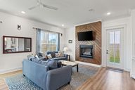 Sleek wood fireplaceQuartz countertopsHigh ceilingsArchitectural ceilingSpa-style bathSpacious primary suiteCovered patio