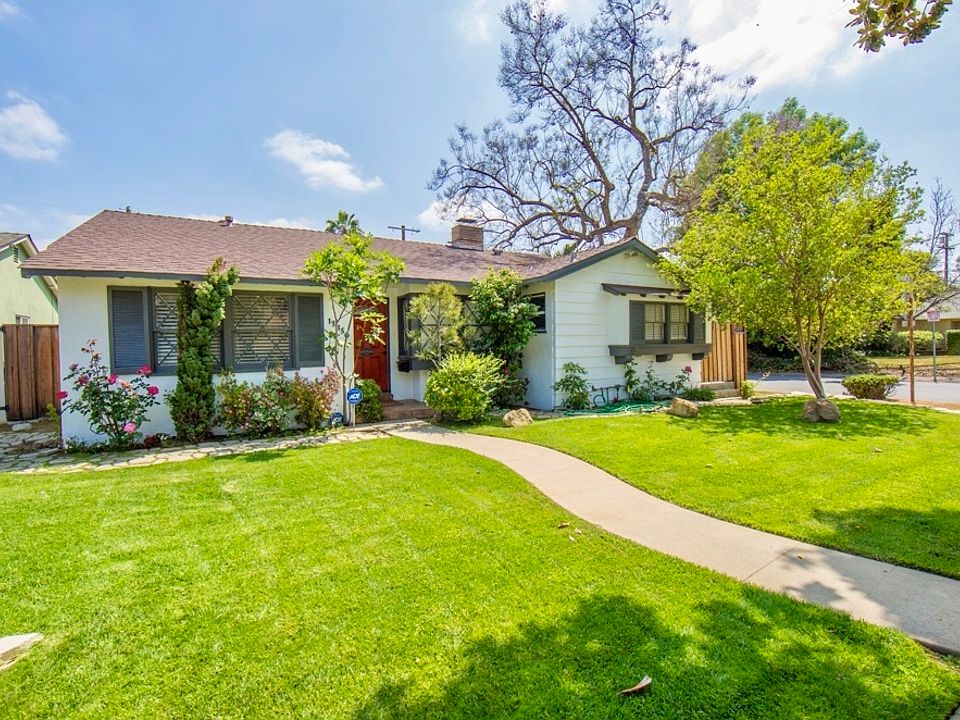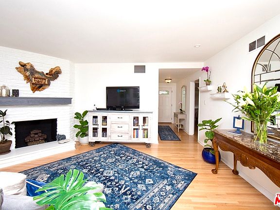 Completely remodeled French Country 1-story garden home on an almost 7,000 SF corner lot is a dream come true...Owner's spared no expense with this immaculately renovated, beautifully lit, hardwood flrd throughout, great open flr plan with stainless steel applianced kitchen accented with brushed silver hardware & white quartz countertops suited with Solid wood, matte white painted, soft closure Kitchen drawers & Cabinetry that opens to dining area. Bright Mstr bedrm has large wall to wall closet & french doors leading to the plush flower gardened landscaped backyard. Both en suite 3rd bedrm bath & full bath offer white tiled/Carrera marble vanity and white matte slow closure drawers & cabinetry. Fireplace is decorative and owner will not offer any credits in regards to fireplace. Free standing Garage has it's own door entrance, window, has polished concrete flooring and it's own air conditioning unit. It may be used as a bonus room, home office, man cave or separate living space.