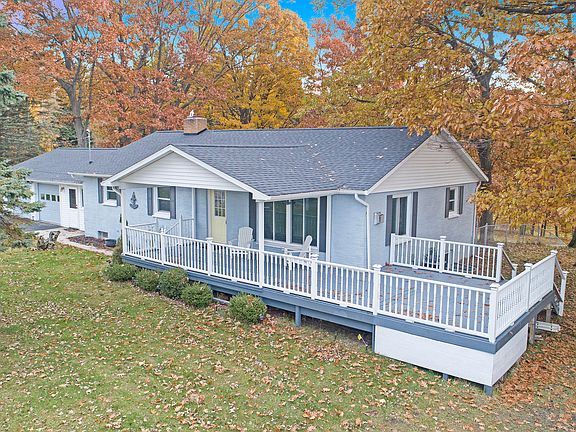 Enjoy views of Lake Michigan from your front porch! A unique opportunity to own 2.28 acres across the street from the lake. Around the bend from Buttersville Peninsula, enjoy the sugar sand on Buttersville Beach, just a short walk from your house. The kitchen has brand new quartz counter tops and new stainless steel appliances. Main floor master suite has a private full bath. The finished basement has 2 bedrooms with egress windows, a full bath, and a family room with a fireplace. There is an attached 2 car garage, another detached 24x24 2 level insulated garage, and a pole barn that is 32x39. Back yard is fully fenced, with a 550' chain-link fence. Buttersville campground is steps away. So many ways to enjoy the outdoors with this home.