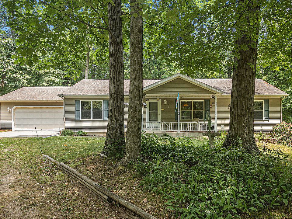 Tranquil setting in the woods. Lovely ranch home, 3 beds, 2 full baths, well maintained, clean and comfortable. Partially finished basement , egress windows, and stubbed for a 3rd bathroom. 2 1/2 car garage, garden sheds with mature plantings. Easy access to 131, Three Rivers schools. Appliances are included and the seller will require 30 days to give possession.