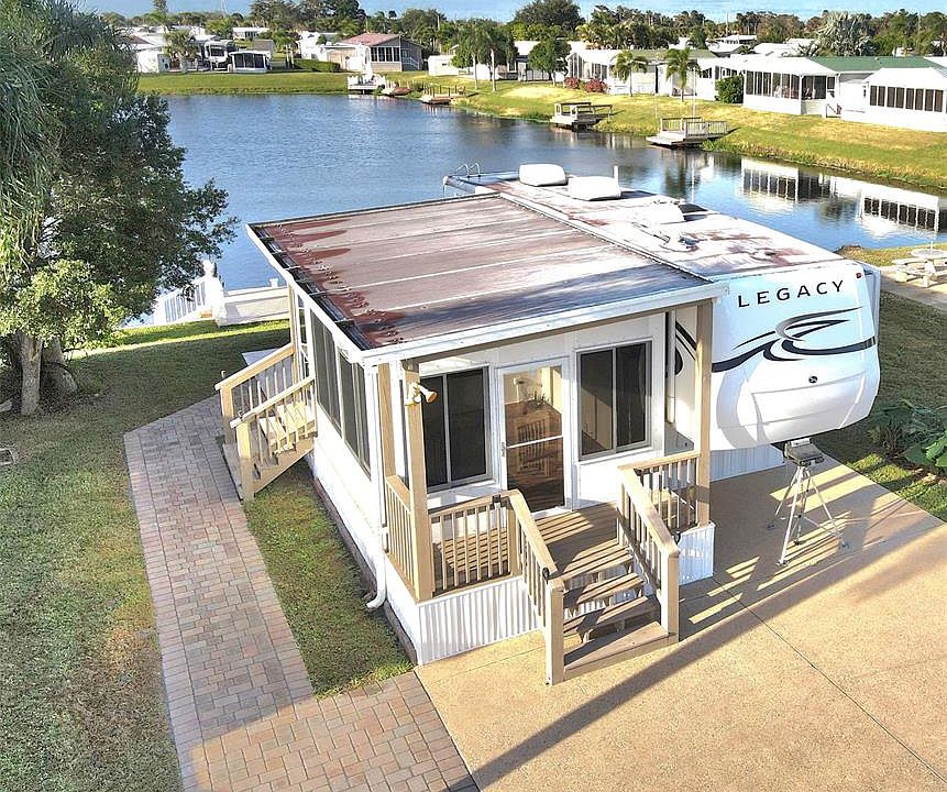 ~Blue Cypress Golf & RV Resort~ This 38-foot Legacy by Jayco fifth wheel offers comfortable living with 1 bedroom featuring a California king bed and 1 bathroom. The home includes 3 slide-outs for spacious interior living and is completely furnished and all major appliances. 2 AC units ensure comfort. The property features a seawall, composite dock, and painted driveway with decorative flakes. Additional amenities include an 8x10 storage shed, a 12x12 office/patio space, and a cedar closet. The HOA provides amenities, including a pool, lawn care, sewer, water, a pickleball, and a 9-hole golf course. Located at beautiful Lake Okeechobee, this turnkey property offers the perfect blend of comfort and recreation for those seeking a relaxed Florida lifestyle. All measurements are approximate.