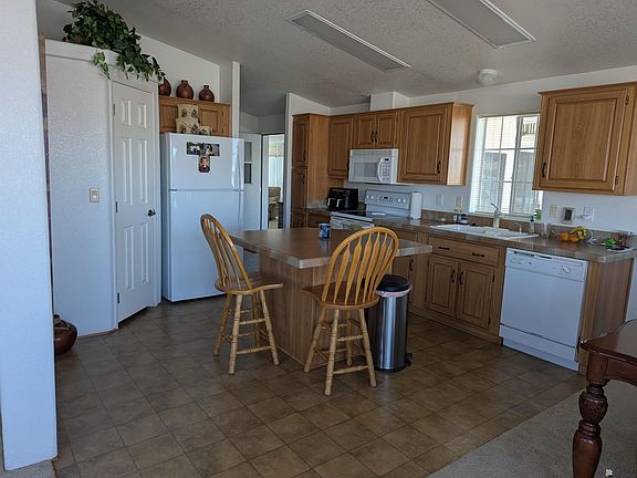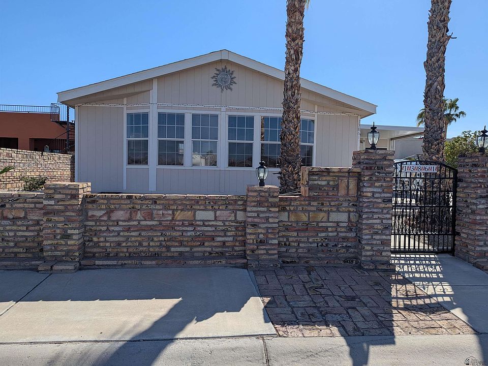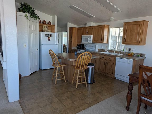 Beautiful, very well cared for double wide home. This could be your full time year around home or wonderful winter retreat. Two bedrooms, 2 full baths and one 3/4 bath. A huge glassed in AZ room, perfect for family room and/or entertaining large groups. Has step saver kitchen with island/breakfast bar. Formal dinning room off the living room. Den/office has built in desk. Out back has lots of concrete for patio enjoyment. Guest house in back has 3/4 bath and roll up garage door if you would want to store your desert toys. There are full RV hookups with 50/30 amps. AND with all this, it also comes fully furnished, ready to move in!