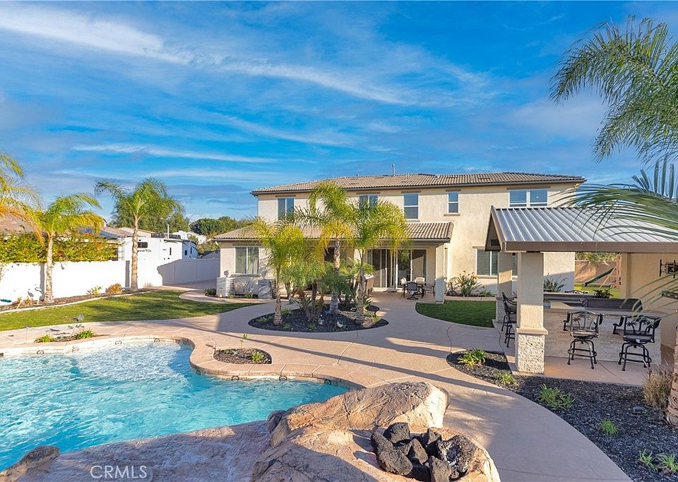 The backyard is a true showpiece — a private oasis designed for year-round enjoyment. Highlights include a heated saltwater pool and spa, complete with a dramatic rock waterfall, waterslide, and hidden grotto, creating a one-of-a-kind resort ambiance. Entertain effortlessly under the oversized gazebo featuring a horseshoe bar and outdoor kitchen, or relax by the firepit and outdoor fireplace while taking in expansive views and sunset skies. A dedicated turf play area adds versatility for recreation and outdoor activities.