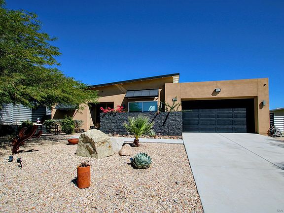 Breathtaking mountain views and a sparkling pool set the scene for this well-maintained mid-century–style home on a quiet cul-de-sac near the Spa District. Built in 2017, this 2,054 sq ft residence combines dramatic architecture, soaring ceilings, oversized windows, and light-filled living spaces that bring the desert landscape right inside. The open-concept kitchen is a showstopper, featuring an impressive island with under-counter lighting, abundant cabinetry, and seamless flow into the living and dining areas—perfect for entertaining. Durable tile flooring runs through high-traffic zones, while plush carpet adds comfort to the bedrooms. The primary suite offers a spacious walk-in closet and a serene retreat, while the secondary bedrooms share a stylish Jack-and-Jill bathroom, creating both privacy and convenience for family or guests. Step outside to your private desert-chic oasis: sparkling pool and spa, two gazebos, and low-maintenance landscaping—perfect for relaxing or entertaining. Practical upgrades include a paid-off solar system for the home, a tankless water heater, a two-car garage with extensive built-in shelving, a storage shed, and no HOA fees. Sitting on a generous 10,018 sq ft lot, this 3-bed, 2-bath gem combines style, comfort, and savings—ready for you to enjoy now.