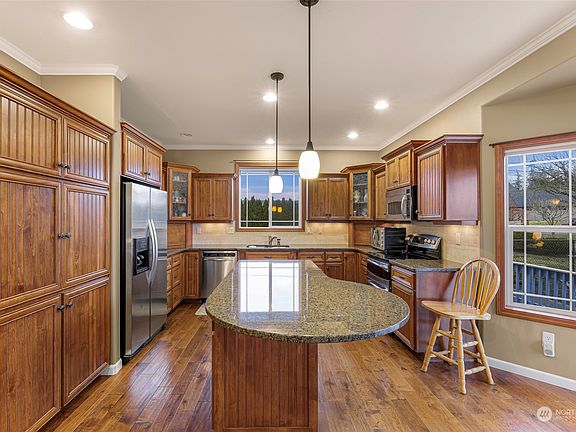 Priced to sell quickly! Can live like 2 separate homes. Located on a corner lot, this stunning contemporary residence rests on the outskirts of town, offering a picturesque view of the valley and Mt. Baker. Spanning over 4100 sq ft with 4 bedrooms, this home showcases custom finishes such as granite counters, crown molding, an intercom system, central vac, AC, french doors, & a well-designed floor plan. The lower level features a 2nd kitchen, creating a comfortable living space in a fully finished daylight basement. House was recently repainted and has a newer furnace, water heater and roof. Ample storage is available throughout the house, complemented by an attached 3 car garage, all situated on an expansive and beautifully landscaped lot.