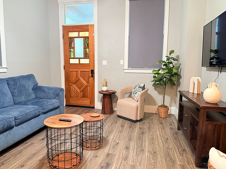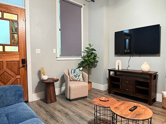 This beautifully appointed apartment is move-in ready with modern furniture and all essentials. Features include a spacious living room with Smart TV and queen-size sofa bed, dining bar seating for 4, fully equipped kitchen with appliances and cookware, private laundry area with washer/dryer, and a large bathroom with vanity and tub + shower. The bedroom offers a queen bed, Smart TV, desk, closet, and private balcony. Located just 1.1 miles from the French Quarter, with quick access to downtown, dining, and entertainment. Public transit stops within walking distance and freeway access nearby. Grocery stores, Walmart, and convenience shops are all less than 2 miles. Mary McLeod Bethune Elementary is 1.6 miles away, with additional schools and universities within 3 miles. A safe, well-connected area perfect for comfortable living.