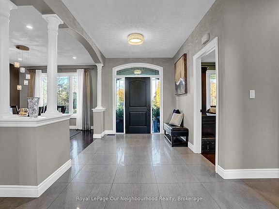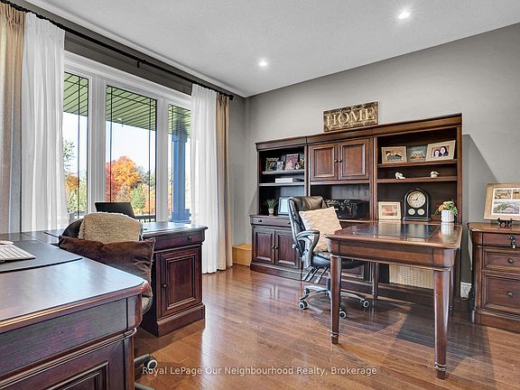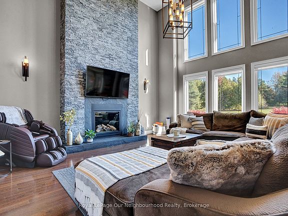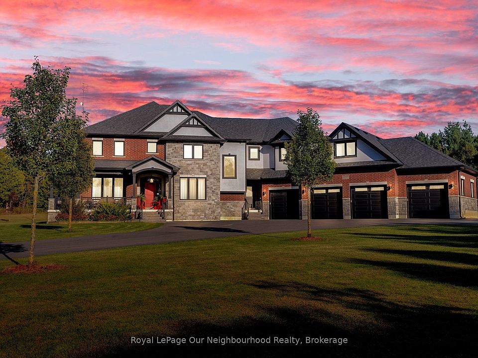 Welcome to this extraordinary 4,000+ sq. ft. custom-built estate sitting on over 10 acres, a rare opportunity to own a true masterpiece of space, design, and lifestyle. This one-of-a-kind detached home offers 5 spacious bedrooms, 6 luxurious bathrooms, and endless room to live, entertain, and unwind. Step in an open-concept layout featuring soaring ceilings, elegant finishes, and a massive chefs kitchen complete with top-of-the-line appliances, a huge center island, and walk-in pantry, perfect for hosting and everyday living. The primary suite is a true retreat, featuring a spa-inspired ensuite, oversized walk-in closet, and peaceful views. The bonus family room above the garage a bright, oversized space that makes the perfect media room, teen hangout, or home office. The heart of the basement is a custom full bar setup, complete with bar seating, built-in cabinetry, beverage fridge, and plenty of space to gather with friends and family. Adjacent to the bar, a cozy family room with a fireplace offers the perfect setting for movie nights or casual lounging. For wellness and fitness, the basement includes a dedicated home gym. Step outside to your very own resort style backyard, complete with a inground pool, surrounded by stone patio for ample space for entertaining. Just steps away, the covered back porch features a hot tub, creating the ultimate spa-like escape where you can soak and unwind in total privacy. Beyond the pool area is a multi-purpose tennis court, perfect for year-round enjoyment. For summer, it's ideal for tennis, basketball, or casual games, while the winter, it easily transforms into a private ice rink bringing seasonal fun right to your backyard. Set on a breathtaking 10-acre property, this estate offers the perfect blend of privacy, space, and natural beauty. A long driveway leads you up to the home, creating a dramatic and welcoming entrance. There's ample parking for guests and gatherings, making entertaining easy and convenient.