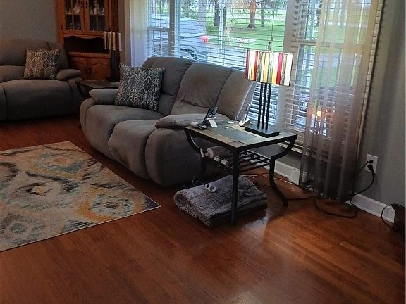 - Description: Living room with electric fireplace, corner cabinets and gleaming hardwood flooring.,Flooring: Hardwood