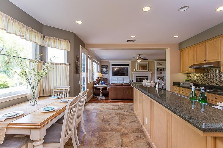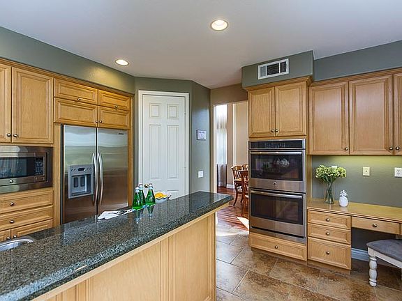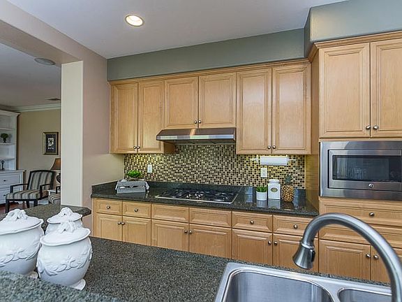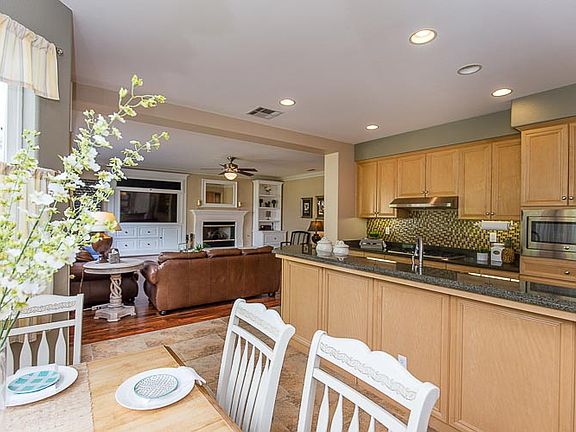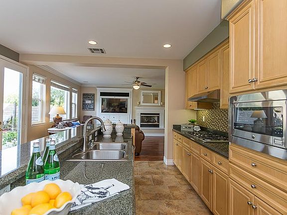 This beautiful 6 bedroom 5.5 bath private Moorpark home behind the gates of Cantara@Serenada is perfect for multi-generational family living. With newly polished wood floors throughout. It has 2 bedrooms and 2.5 bath downstairs. The single car garage has been converted into a bedroom with en suite bathroom and small kitchenette area and closet. Another secondary bedroom with en suite bathroom is also located downstairs. The beautiful remodeled kitchen with Carrara marble counter tops and hand painted marble tile backsplash with eat in kitchen, stainless steel appliances, double ovens and walk in pantry sits adjacent to the large family area with fireplace and built in book shelves. The large 2 car garage has direct access to the home. The large Primary Bedroom has a beautiful spa like feel with an extra large walk in closet. There are 4 bedrooms upstairs, two share the full bath and the additional bedroom has it's own en suite bathroom. The beautiful private backyard has built in BBQ, refrigerator and gas fire pit and lovely mountain views. Front and back yard have turf and low maintenance plants with drip system. This home is close to parks and shopping.