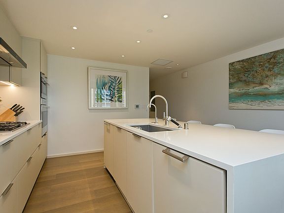 Ocean viewsDesigner furnishingsFloor-to-ceiling glassOpen-concept layoutGourmet kitchenNatural stone countertopsCustom cabinetry