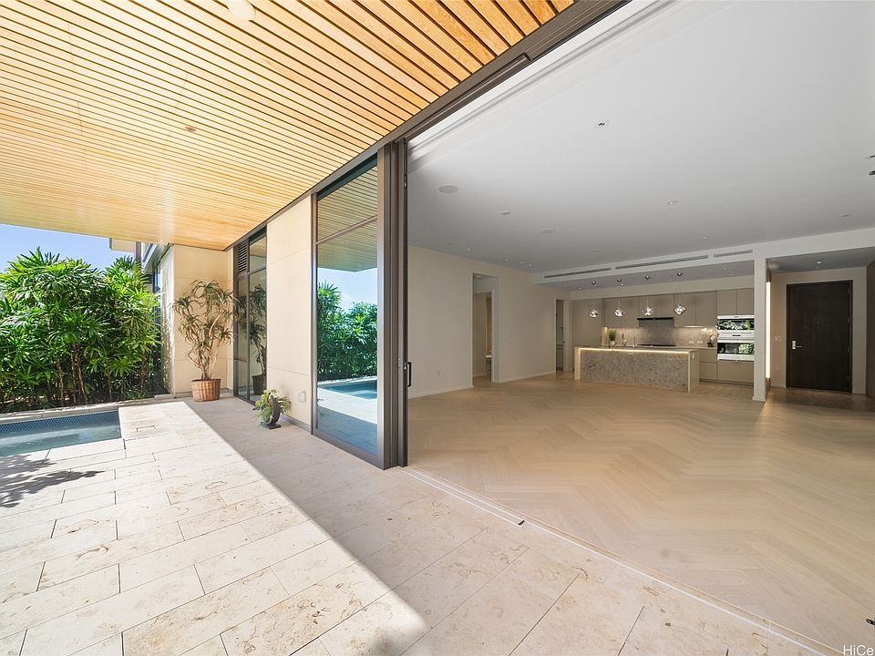 Step into a grand entryway adorned with custom wood panels and a striking Taj Mahal quartzite accent wall in a leathered finish from Brazil, setting the tone for the exquisite craftsmanship throughout. The new sandy tones European oak wood floors throughout the living space, laid in a stunning herringbone pattern, add warmth and depth to the space.