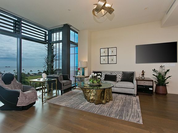 Step out onto your expansive private lanai and take in sweeping ocean, city, and harbor views that frame the ultimate indoor-outdoor lifestyle. The open-concept living space features elegant furnishings, high ceilings, and floor-to-ceiling glass that fills the home with natural light.