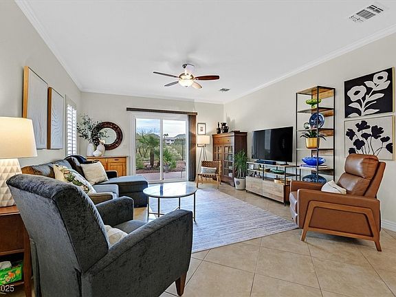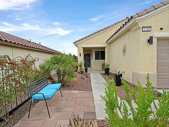Great curb appeal in front and VIEWS in the back! This lovely home has it all. Natural light makes this home bright with tile floors on the diagonal an upgraded fixtures that include kitchen and primary bath light fixtures inside and new front coach lights and back porch lights outside. Front security door provides privacy too.This house has beautiful tile throughout. Greatroom is spacious and has sliding glass doors to backyard. Backyard with mountain views is perfect for relaxing under the covered patio. The lush landscaping is easy care but brings color.Kitchen has newer and upgraded stainless steel appliances. Kitchen has ample cabinetry, granite counter tops and an eating area. Primary bedroom is spacious and has a window to the backyard. The primary bath has dual sinks, large shower and Walkin closet. Some rooms are newly painted too! The second bedroom has closet and closet to bathroom 2 which has a tub/shower combination. The garage has great storage. Immaculate !!