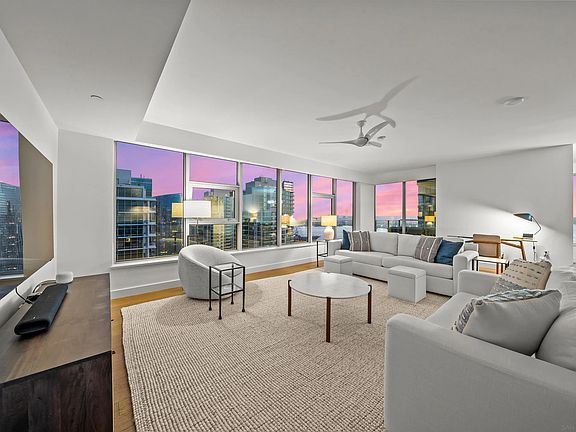 Welcome to Residence 3205, the largest and most sought-after floorplan at Savina, Downtown San Diego’s newest luxury high-rise. One of only two residences in the building with this layout, 3205 offers a truly rare opportunity and showcases sweeping southwest-facing views of the bay, city skyline, and vibrant sunsets from every room. This spacious 2-bedroom plus den, 2.5-bath home features two private balconies - one off the living room and another off the primary suite - creating a seamless connection between indoor and outdoor living. The expansive great room is ideal for entertaining or simply enjoying the panoramic views. Both bedrooms include en-suite bathrooms and large walk-in closets, while the versatile den can be enclosed to create a third bedroom or private office. A dedicated dining area adds flexibility and functionality to the open-concept layout. Additional upgrades include Lutron motorized shades throughout, with blackout and solar options in the bedrooms for added comfort and privacy. Savina offers one of Downtown’s most extensive amenity collections, including a 24-hour concierge, heated pool and spa, state-of-the-art fitness center, social lounge, business center, conference room, pet retreat, bike storage and repair station and EV charging stations - just steps from the waterfront and Little Italy.