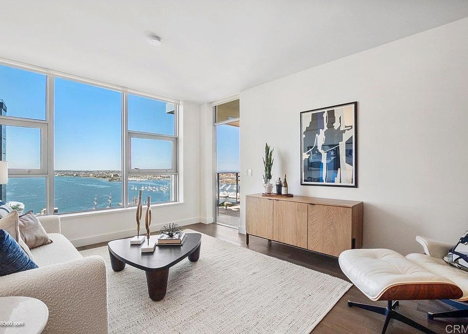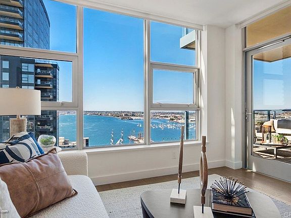 Immerse yourself in the breathtaking water views that surround this 23rd floor luxury residence in Savina, one of downtown San Diego’s premier high rises. The west-facing orientation offers captivating Pacific Ocean, San Diego Bay, and vibrant city views, making this one of the most sought-after and rarely available floor plans in the community. The generously sized primary suite provides a tranquil retreat, while the kitchen, appointed with the Urban color palette and Thermador appliances, exudes modern sophistication and elegance. The open-concept living space seamlessly connects to a spacious patio, perfect for unwinding while taking in the stunning sunsets and city lights. The primary ensuite features western and northwestern water and city views, a large walk-in closet and spa-like bathroom with dual-sink vanity, pendant lighting, and a walk-in shower with two shower heads. The second bedroom with bay views and dual closets is served by an artsy hallway bathroom with plenty of storage. Included are two tandem parking spaces with an EV charging station and a private storage cage. Savina’s impressive amenities extend your living and entertaining space, with a high-end resort pool and spa, a community meeting room with a full kitchen and city views, a state-of-the-art fitness room, dry sauna, steam room, and dog retreat with a grooming station. The beautiful lobby with high ceilings and modern finishes is serviced by friendly staff with 24/7 management, adding to the luxurious experience. Centrally located in the Columbia District bordering Little Italy and the upscale Marina district, Savina offers unparalleled urban living with easy access to dining, entertainment, sports, and relaxation activities. The boardwalk along the Bay and ferry to Coronado are just moments away, ensuring a vibrant and convenient lifestyle.