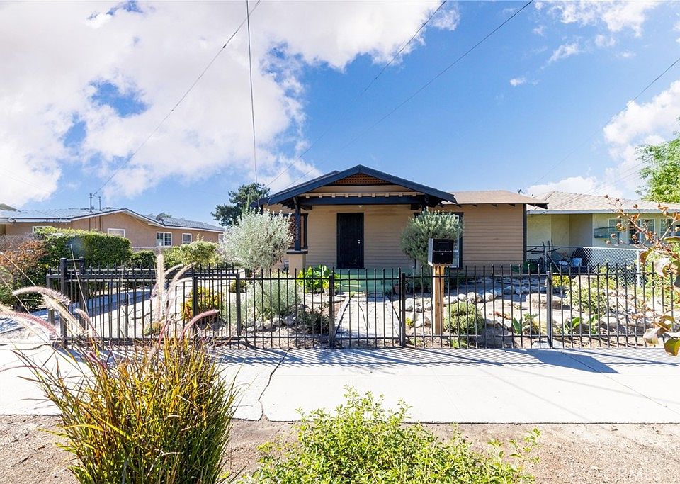 Charming 1923 Vintage Home with Character and Modern Comforts. This beautifully maintained 2-bedrooms, 1-bath vintage home, offers a perfect blend of period details and thoughtful updates. The inviting curb appeal features year-round landscaping with mature plants and flowers, a warm welcome upon arrival. Inside pendant lighting highlights the office/desk set-up upon entry, before entering into a bright living room, bathed with sunlight from the large double-pane picture window and French doors that open to a quaint outdoor patio. A custom glass-framed wall with sliding door, uniquely separates the office area from the living room and sitting TV area, creating a versatile living space. The Kitchen offers upper open shelving, lower cabinetry, a vented hood over stove that blends vintage charm with functionality. Bath includes a vintage vanity, and faucet, including a tub-shower combo. Both bedrooms include new ceiling fans; the front bedroom features a custom barn-door closet, while the spacious second bedroom boasts a walk-in closet. Laundry is located on the service porch with access off the kitchen or directly from the backyard. The fully fenced 7,750 sq. ft. lot is dotted with fruit trees-including almond, pomegranate, and plum and includes a detached one-car garage with a tandem, and upper cabinets for lots of storage. This delightful home combines the character of 1920s architecture with thoughtful modern updates – a rare find for vintage-home enthusiasts. Conveniently located near freeways, shopping, parks.