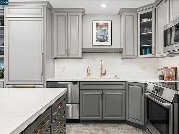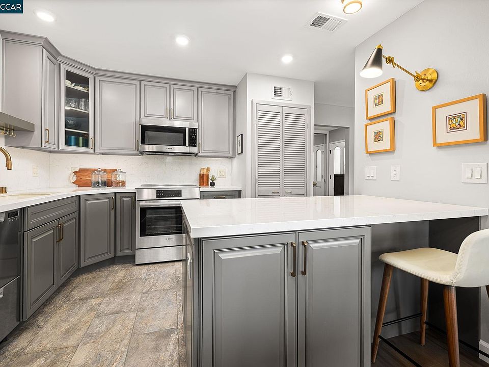 Located in Rossmoor, Walnut Creek’s premier 55+ community, this beautifully renovated Sonoma model blends modern sophistication with serene, park-like surroundings. The open layout features smooth ceilings, hardwood floors, and abundant natural light through triple pane Pella windows and sliders that open to a balcony with peaceful views. The fully remodeled kitchen showcases all wood KraftMaid cabinetry, quartz countertops, a large island with bar seating, Brizo faucet, water filtration system, and premium appliances including a Bosch induction range, Fisher & Paykel two drawer dishwasher, and built in Thermador refrigerator. A custom buffet and Thomas O’Brien lighting enhance the dining area’s style. Both bedrooms include custom closet systems, and the updated bath features quartz countertops, modern cabinetry, and designer fixtures. Additional highlights include an LG washer and dryer, mirrored entry doors, and convenient carport parking. Residents enjoy a vibrant 55+ lifestyle with resort-style amenities including clubhouses, pools, fitness centers, walking trails, social events, and optional golf memberships, plus gated security and community transportation.