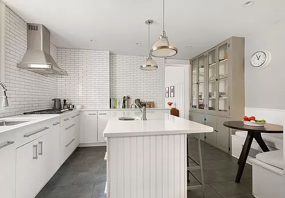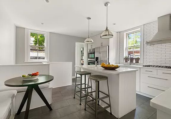 A fully renovated open kitchen includes white, gray and glass cabinetry, stainless steel professional appliances, a backsplash of subway tile, white Quartz countertops, and a built-in banquette breakfast nook. This L-shaped kitchen offers great storage and work space, and even includes a large prep island. Situated perfectly between the dining room and garden, you can easily entertain whether it be indoors or out, all year long. Old growth English Plane and Magnolia trees define this distinctive three-sided yard that also offers hardscaping for a dining area. You will truly forget that you are in the city. The next floor up offers two large bedrooms PLUS an unexpected office space. A full bathroom with a window and the classic NY finishes includes white and black hex tiles, a pedestal sink and cast-iron tub. The oversized front bedroom is a dramatic space with bay windows, while the back bedroom offers a full yard view. The top floor is currently being used as a master suite and includes another bedroom with bay windows looking into the neighboring treetops plus a newly renovated full bath complete with cast iron tub and penny tiles that separates this room from two smaller bedrooms in the back. One has been magically transformed into a walk-in closet, and the other that now lives as an office, but also makes a great nursery or guest bedroom. Skylights on this floor bring light down the entire staircase all the way to the parlor. The garden level has been fully finished and offers a multitude of options. In the back is an enormous laundry room with cabinetry and a utility sink, including an oversized vented washer and dryer. In the center of this floor are the mechanicals and ample storage space. The front has been transformed into a fantastic media room, home office, play room or, with the addition of a newly renovated full bathroom, make this a great nanny or guest suite as well. This truly is a home that has it all. Sitting pretty on one of the single most beautiful blocks in Brooklyn, with easy access to the great shopping and dining in both Prospect Heights and Crown Heights. Enjoy Franklin, Washington and Vanderbilt avenue amenities, in addition to Brower Park, The Children's Museum, Prospect Park, the Brooklyn Museum and the Botanic Gardens. A new Union Market is easily accessible on Eastern Parkway too. One block to the 3 train and three blocks to the 2 and 5 express trains.