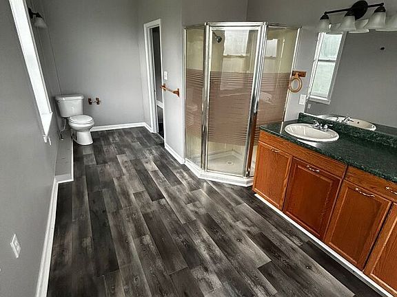 Plush carpeting throughout the bedrooms and main living areas adds warmth, while the windows invite natural light and gentle summer breezes. The generously sized bathroom features durable LVT flooring, a wide wood vanity with ample counter space, and a standalone shower.