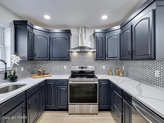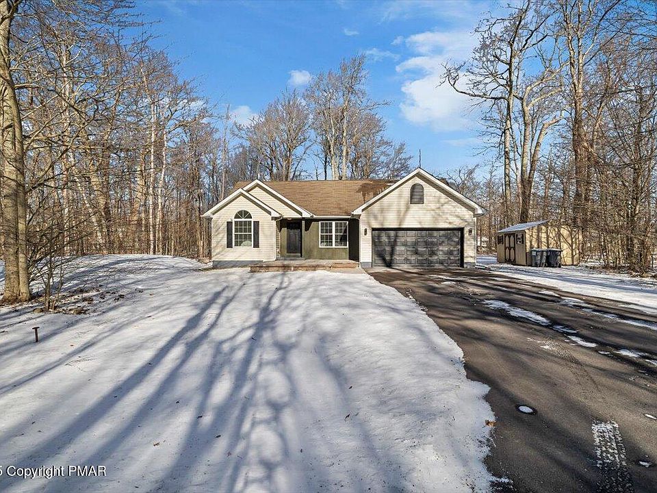 MOVE RIGHT IN to this Stylish Contemporary RANCH! Located in amenity filled POCONO FARMS COUNTRY CLLUB. Short term rental friendly. Just minutes from 18 Hole PGA Rated golf course.Freshly updated with attention to detail. 3 bedroom, 2 full bath with spacious 2 car attached garage and storage shed. The kitchen boasts all new stainless appliances, electric range with vent hood, quartz counters, tile backsplash, recessed lighting and upgraded fixtures. New vinyl plank flooring throughout. Primary bedroom features tray ceiling with fan and large walk in closet. Primary bath features tile floor and shower, new vanity and fixtures. All lighting has been upgraded. Newer Carrier forced air HVAC unit. Flat cleared parcel with distanced neighbors and greenbelt across.