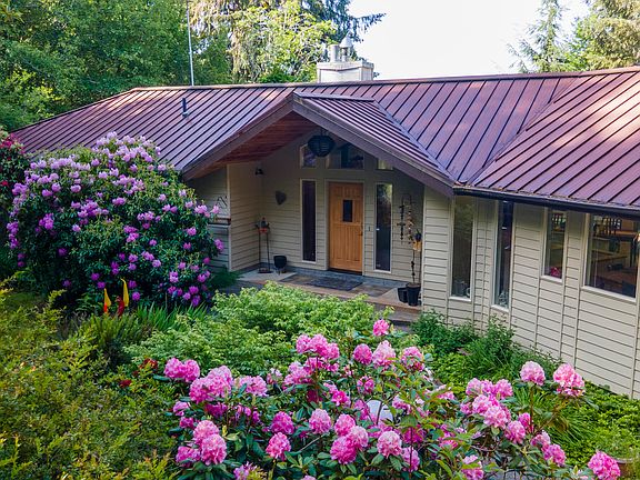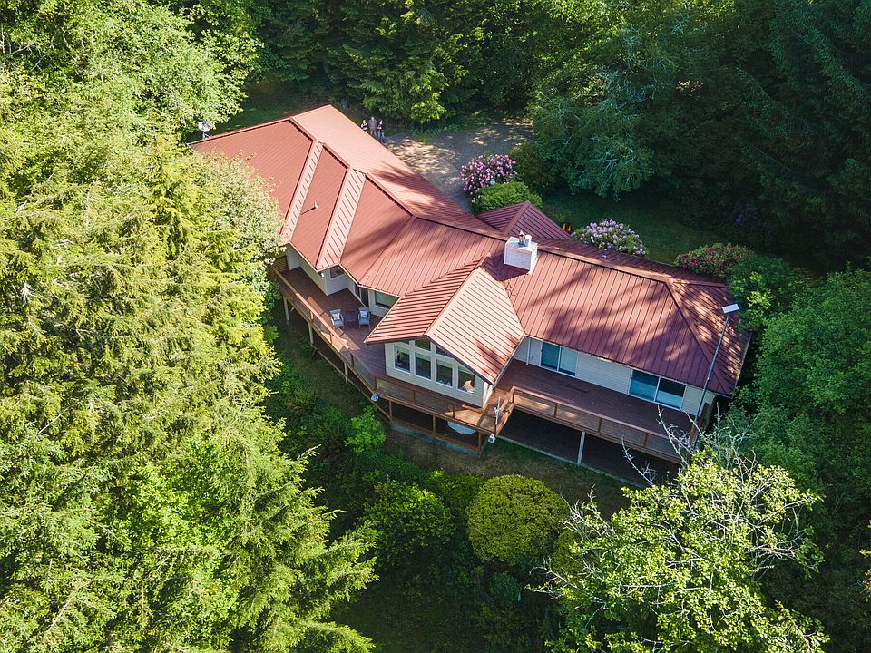 A rare chance to own a private riverside residence nestled in a mature coastal forest. This 3-bed, 3-bath and 2 bonus rooms home sits overlooking a beautiful river. Towering old-growth trees and daily wildlife sightings. Inside, vaulted ceilings and oversized windows bring the outdoors in, with natural light pouring into the open living space. A wood-burning fireplace anchors the living room, framed by stone-tiled entry, warm wood floors, and upgraded carpet throughout.The kitchen features spacious countertops and electric appliances, with forest views from every angle. The primary suite includes a walk-in closet, river view, a jetted tub, and a separate shower. The main level also includes a spacious office or reading room. RV garage, 2 work shops and a separate Bunkhouse for guests. Downstairs: two generous bedrooms, a full bath, and a second living area with two bonus rooms ideal for guests, hobbies, or potential multi-generational living.