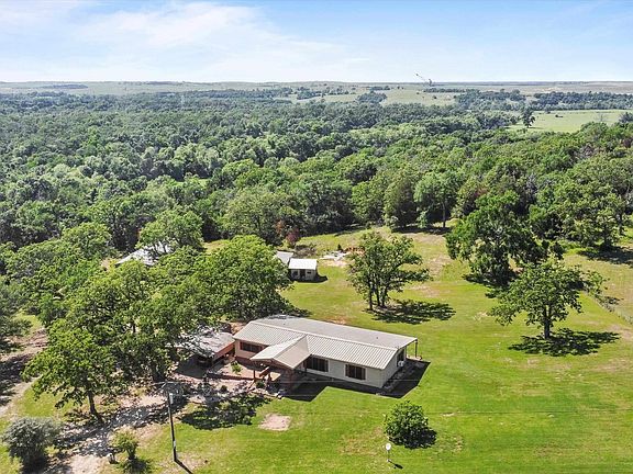 PRETTY COUNTRY SETTING! Come see this charming three bedroom, two bath home situated on 4.64 manicured acres in Leon County. Located at the end of the dead-end CR 355, this property offers privacy with the convenience of town amenities just a short drive away. The well-maintained home has a new metal roof, new smart siding, new HVAC system installed 9/25, and new front and back porches. The home features a spacious layout – large living area with gas log fireplace, formal dining area, an eat-in island kitchen with custom cabinets with pull out drawers for pots and pans, and a handy laundry room. All appliances will convey with the sale of this home. The primary bedroom has a huge walk-in closet, his and her sinks, large soaking tub, and walk-in shower. Two guest bedrooms are nicely sized and share a hall bath. Outdoors, you will love sitting on both the covered 15’x13’ front porch, and 10’x67’ covered back porch with wheelchair access. There is a 22’x24’ 2-car carport, a 14x14’ golf cart shed, 40’x40’ shop, and a 60’x30’ equipment barn with an attached 18’x30’ office with its own a/c. All out buildings have electricity and are on a concrete slab except the equipment barn. This home is equipped with a 24KW generator, 500-gallon propane tank, and is skirted with red brick with weep holes to allow ventilation. This property is sure to check all the boxes, call today to schedule a private tour!