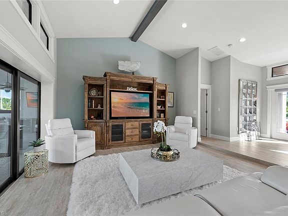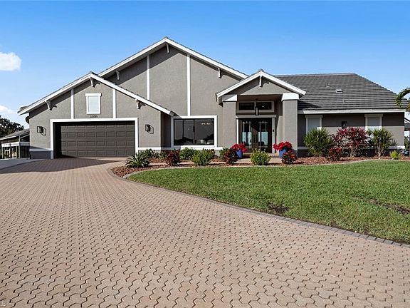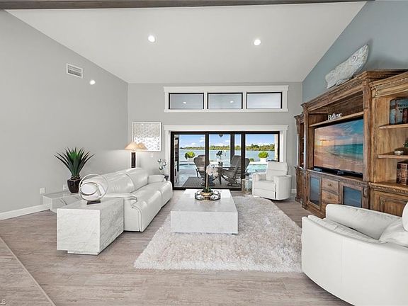 Waterfront dream home, perfectly nestled at the end of a private peninsula on the Caloosahatchee River, offering direct Gulf access. This three-bedroom, two-bath gem is a boater’s paradise, featuring a boat house, a 40,000-pound boat lift, and a dual jet ski lift for seamless adventures on the water. Step inside and be greeted by an inviting foyer that leads to a sunken living room, where expansive western-facing windows showcase breathtaking sunsets over the river. The open-concept kitchen is a chef’s delight, complete with a spacious quartz island, custom cabinetry, and seamless flow into the family room, which features a cozy fireplace and river views. The split-bedroom floor plan ensures privacy, with the luxurious master suite with custom wood details offering direct river views, sliding door access to the pool area, and a spa-like ensuite bathroom with dual vanities, a large walk-in shower, and a generous walk-in closet. The rear guest bedroom also boasts pool access and a private slider leading to the boat house. Outside, your personal oasis awaits. Relax on the covered patio, lounge by the pool, or unwind in the hot tub—all while taking in the serene beauty of the riverfront setting. With panoramic water views and luxurious amenities, this home effortlessly blends elegance with tranquility. For added peice of mind, flood panels have been installed to protect from water intrusion! Don’t miss the opportunity to own this extraordinary riverfront retreat—perfect for those seeking the ultimate Florida lifestyle!