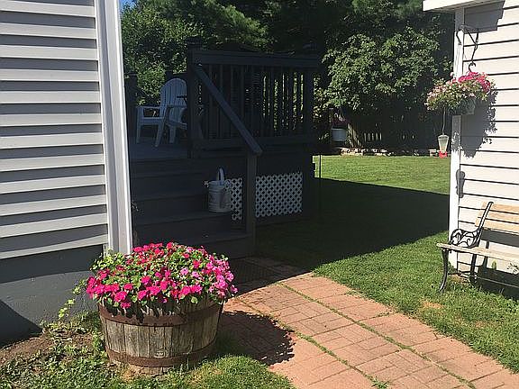 Our home is situated on a nice lot with great neighbors. The outdoor space is nicely landscaped with shrubbery, trees, a small garden area and a large backyard. Parking for three cars is available and a detached garage is great for storage and puttering. The home is two stories with vinyl siding and shutters. The roof is asphalt archetectual shingles and windows are double hung vinyl with grills. A roomy deck sits on the back which gets nice sun and is perfect for lounging and barbecuing.