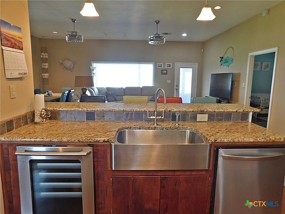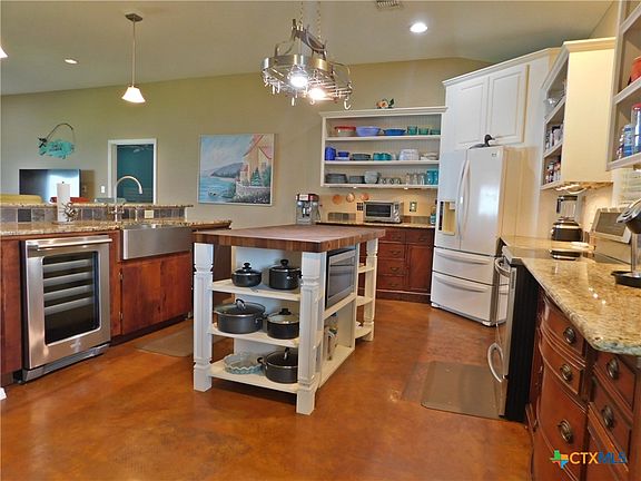 Discover a rare opportunity to own an exceptional home on the Texas Gulf Coast. Located 8 miles from Port Lavaca, a 2-hour drive from Houston, and 1.5 hours from Corpus Christi, this well-maintained property boasts 1846 SF of living space with an additional 612 SF bonus space. Nestled on over 5 lots in the sought-after Alamo Beach community, the main house features a fully equipped island kitchen, two master suites, an enclosed patio, storm shutters, and extensive outdoor space perfect for entertaining. The property includes an in-ground pool, a pergola, an outdoor shower, a sprinkler system, a fishing pier/boat dock, and a bulkheaded shoreline within a fenced waterfront area. A detached 2-car garage with an attached bonus space, complete with a full bath, offers endless possibilities such as a studio, guest suite, office, or game room. With a separate entrance and a stunning bay view, this space adds to the allure of the property. Ideal as a private retreat for weekends and holidays or as a permanent residence, this home could also be a smart investment if retirement on the coast is in your plans. Consider the potential for short-term rental income to fund your investment. Facing West, the property promises cool breezes and clear views of Lavaca Bay. Enjoy fishing for redfish and trout off your private pier or take your boat out from the community ramp to explore local favorites like Port O’Connor, Rockport and Fulton by water. Nearby Magnolia Beach offers a sandy shore, a crabbing bridge, and covered picnic areas, providing options for everyone in Calhoun County, TX, and beyond.