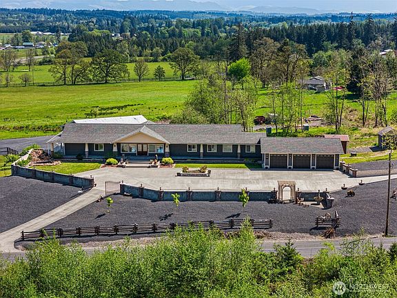 Looking for a property to run your home business from? No detail was left unnoticed when designing this home and property with custom details from top to bottom.The property is set up for a business or personal use; separate entrance for the shop (40x100) and barn/shop (60x64) leaving the option for a home business, construction, trucking etc. The large gravel yard is ideal for turning large trucks or equipment around. The Home offers an open living space with an oversized main living area, oversized island. All bedrooms are on the main floor with a bonus pool/game room downstairs. Grand courtyard, wrap around deck providing views of classic barns and farmland and an incredible view of Mt. Rainier and the surrounding hills.