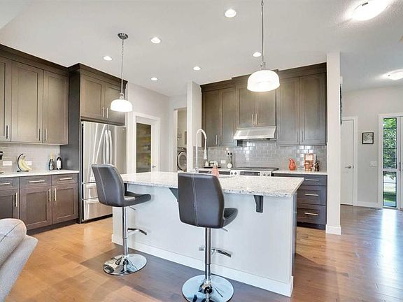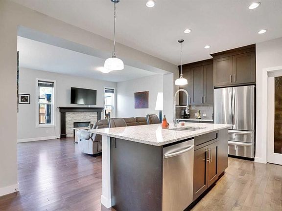 From the moment you enter, you’ll be impressed by the extra-wide staircase leading to the second floor, making move in a breeze; this thoughtful upgrade continues into the upstairs hallway, where the added space truly stands out. Beautiful wood accents and wrought iron spindles add a touch of elegance to this home. The heart of the home is the kitchen, designed for both style and function. An expansive centre island featuring double undermount sinks, dishwasher, and built-in microwave takes center stage, and is complemented by a convenient coffee or wine bar next to the fridge. Warm-toned, full-height shaker cabinets with soft-close system, light contrasting granite counters, and a stylish backsplash create the perfect balance. A premium stainless-steel appliance package includes a double-door fridge with double-drawer freezer, a gas range with electric oven (a favorite combo), a large hood fan and plenty of storage with a walk-in pantry. The main floor also offers a well-planned mud / laundry room with easy clean tile floors, and access to the oversized garage. Rich wood floors flow through the kitchen and living areas, where a cozy gas fireplace with ledgestone surround sets the tone. Large windows and patio doors fill the space with natural light and open out to a west facing backyard with an oversized deck with a gazebo, ideal for summer entertaining or a shaded retreat on hot days. Upstairs, the spacious primary suite is a true retreat. The five-piece ensuite includes a six-foot two-person tub with offset taps, large separate shower, dual undermount sinks, private commode, and beautiful tile floors, along with a generous walk-in closet. Two additional bedrooms, an incredible walk-in linen closet, main bath, and a bonus room with vaulted-ceiling and large windows round out the second floor. The basement is ready for your personal touch with a bathroom rough in, and the added bonus of laminate flooring included to help with the finish. Car enthusiasts will appreciate the oversized 21'x19' garage, with 11' ceilings, which could potentially accommodate a car lift. The exposed aggregate driveway provides durability as well as an attractive finish. The extra-wide street makes parking and maneuvering so much easier, and gives the neighborhood a spacious and welcoming feel. Situated next to the Estate homes, it only made sense to choose upgrades that blend in seamlessly. The result is a beautiful home that combines thoughtful design with everyday comfort and function. Come see for yourself, this could be your next home!